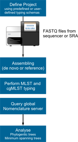 Figure. Microbial WGS next generation sequencing and genome-wide gene by gene (cgMLST) analysis workflow.