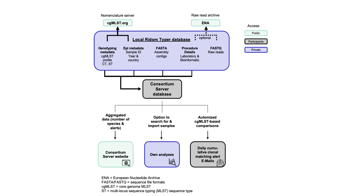 The optional Consortium Server allows several Ridom Typer users each with their own installation to share a minimum agreed upon amount of data (e.g., for [supra]national/regional genomic surveillance or in the framework of a funded project, etc.) while the original and complete data remain locally. The shared data can be used for automatically triggered matching alert (MA) emails once genomes with similar cgMLST allelic profiles are submitted by other organizations or the data can be compared for some sort of trend analysis.