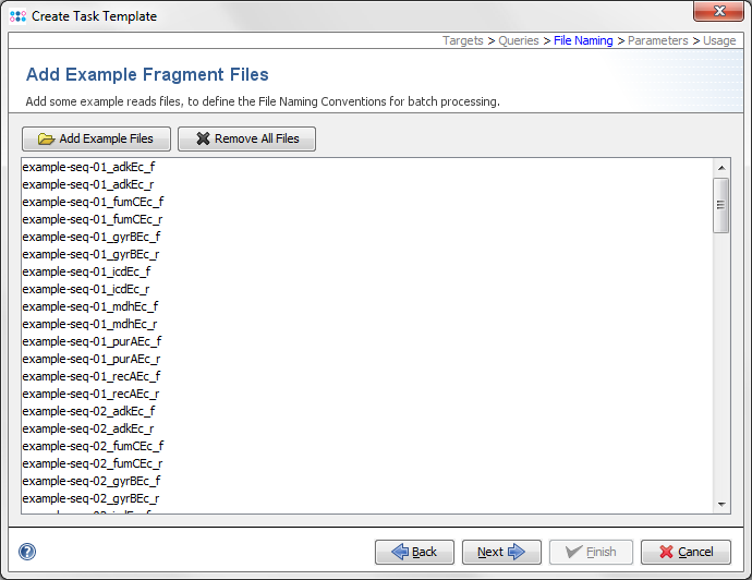 This panel is only shown for Sanger sequencing data. It is used to check the file naming of your sequence files that should be assembled. Choose the Add Example Files and some of your files (FASTA, SCF or ABI) to the list. Press Next to proceed to the next step. |