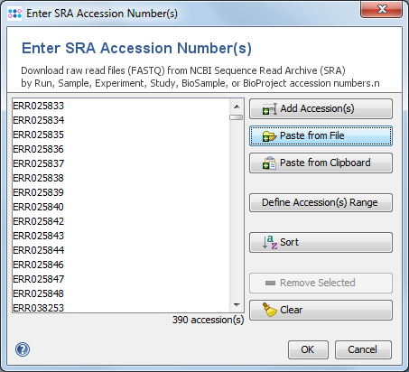 Ridom Typer can be used to download FASTQ files from NCBI Sequence Read Archive (SRA). Invoke the function Tools | Download FASTQ from SRA to open a dialog window and enter or import the NCBI accessions that should be downloaded.