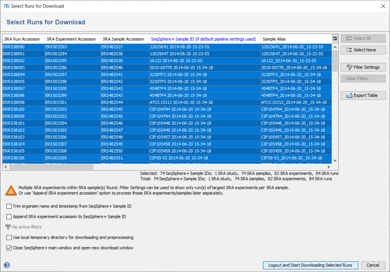 (See more details at NCBI) The found metadata for the given accessions are shown in a table, where each row represents one SRA run. Each SRA run belongs to a SRA experiment, each SRA experiment belongs to a SRA sample, and each SRA sample belongs to a SRA study. A SRA experiment can contain multiple SRA runs done from the same library. A SRA sample can contain multiple SRA experiments and it is usually not a good idea to assemble reads across various experiments. All SRA samples have a Sample Alias and most SRA samples have a Strain Name and a Sample Title that all must not be unique. By default the Strain Name is taken as Ridom Typer Sample ID and the FASTQ File Name Trunk. If the SRA sample has no Strain Name attached then the Sample Alias or the Sample Title is taken instead. The underscore and other special characters (e.g., !, :, /) are in the Ridom Typer Sample ID and the FASTQ File Name Trunk replaced against empty space (the unchanged names are stored in the searchable Strain and Alias ID(s) Ridom Typer data fields, respectively). In addition the SRA run accession is attached with a leading underscore to the FASTQ File Name Trunk. The Ridom Typer Sample ID determines how the downloaded reads are treated. If there are potential problems with the Sample ID, context-sensitive warnings are shown below the table in the left corner of the window. Downloading FASTQs and metadata with default settings would result in assembling multiple SRA runs of the same SRA experiment together once a pipeline with default file naming parameters would be started. However, also multiple SRA experiments of the same SRA sample would be assembled together. To avoid this latter case either use the 'Append SRA experiment accession to Ridom Typer Sample ID' checkbox option to assemble the experiments separately or apply the 'SRA experiments' filter. Similar, if there would be SRA samples with the same Strain Name also those reads would assemble wrongly together. In this case either use the the 'Append SRA experiment accession to Ridom Typer Sample ID' checkbox option to assemble the SRA samples separately or apply the 'SRA samples' filter. Finally, in the unlikely case that two SRA samples have no Strain Name but the same Sample Alias, a warning 'Different SRA samples with the same Ridom Typer Sample ID were found!' would be shown. Again the issue could be solved by using the 'Append SRA experiment accession to Ridom Typer Sample ID' checkbox option to assemble the SRA samples separately. The table can be filtered using the button Filter Settings. Four different filters are available: