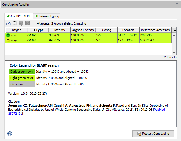 Below the table a colored threshold legend, version information, and citation(s) are stated. Result FieldsFor the confidently found (colored green) alleles the two fields 'O Type' and 'H Type' are rule based filled-in and 27 gene specific fields (e.g., 'Allele Type (wzm)', 'Reference Accession (wzm)', 'O Type (wzm)') are stored as result fields of the task entry. The following rules are applied for fields 'O Type' and 'H Type' according to the publication by Joensen et al. (2015). J Clin Microbiol. 53: 2410-26: Rules for result field 'O Type':