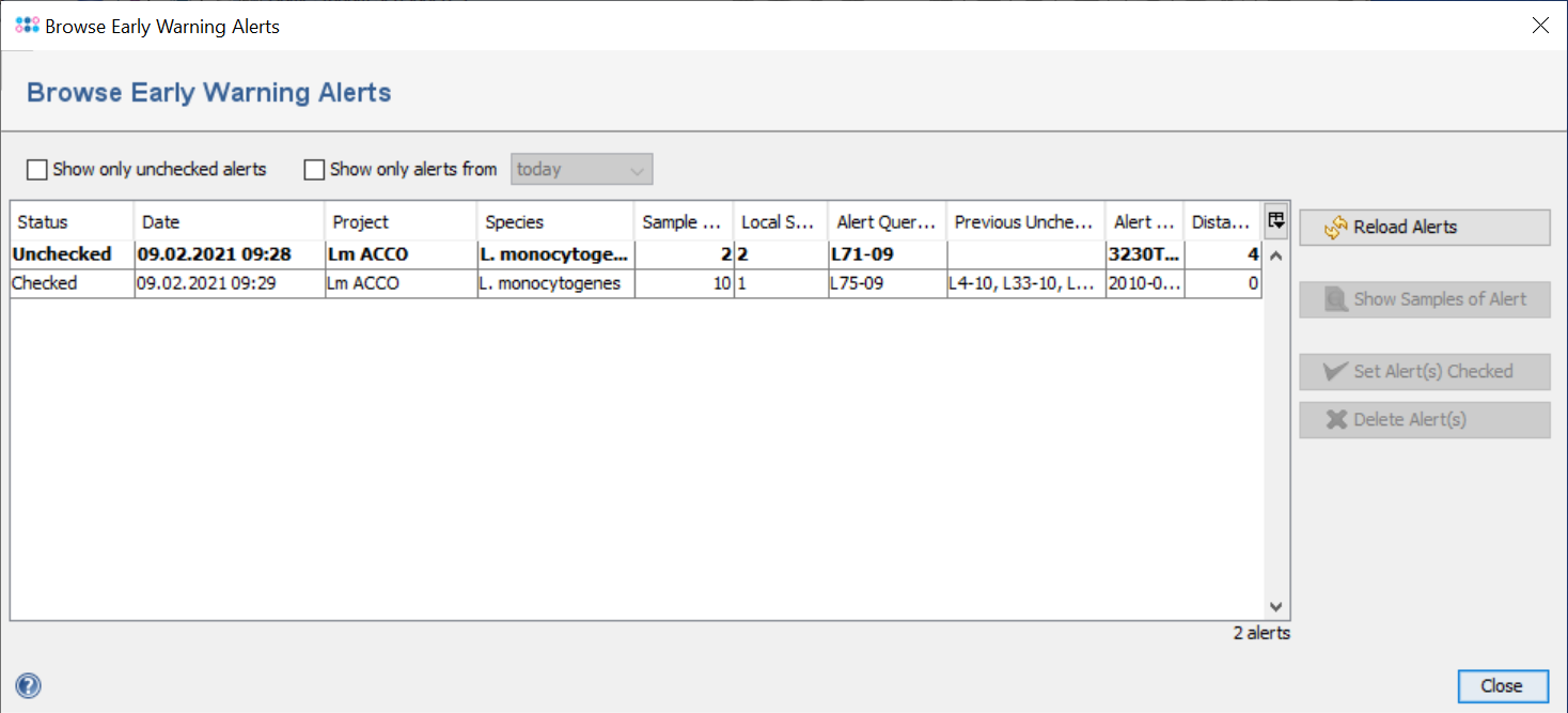 By default the alerts are sorted according to the triggering date. The table can be filtered for unchecked alerts only (default) and/or for a time period. The button panel on the right (or the right-click menu) can be used to set multiple alerts as checked or to delete them. Additionally, a comparison table/a plasmid table can be opened by pushing the button Show Samples of Alert (or by double-clicking in a row) for a selected alert containing all samples or plasmids that are involved in the alert.