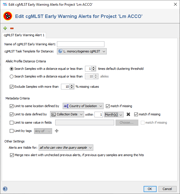 EWAs can be added and deleted at any time when in the project manger window a project is selected and the Edit cgMLST Early Warning Alert Definitions button of this project is pushed. For adding a EWA the Button16-Plus.gif icon must be pushed and the new EWA must be defined. For deleting an EWA the corresponding tab must be selected and the Button16-Minus.gif icon must be pushed. Once the buttons OK of the Edit cgMLST Early Warning Alert Definitions dialog and Save & Close of the project dialog are clicked the definition is added or deleted.