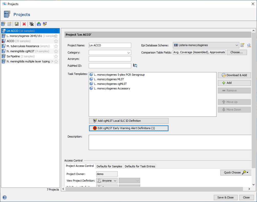 By pressing the buttons OK of the Edit cgMLST EWA definitions dialog and the Save & Close of the project window the EWA is stored and active.