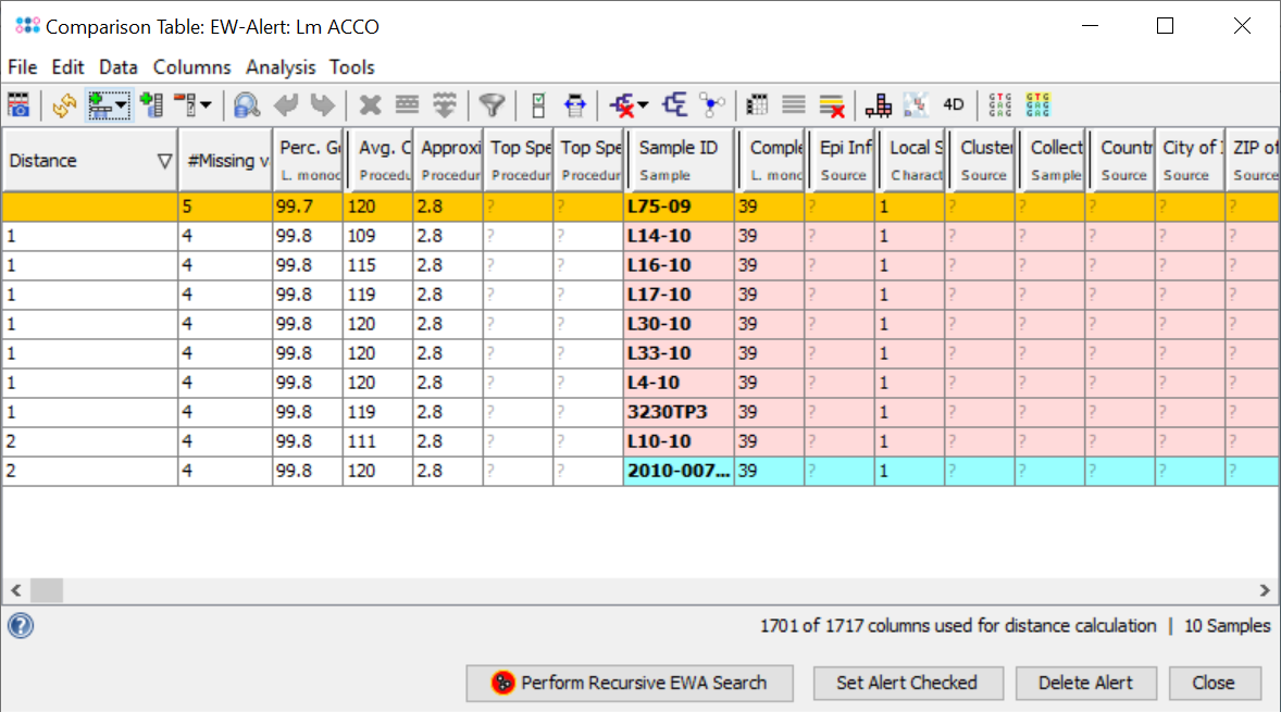 Doc-info.pngHint: If it is intended to increase the discriminatory power for the involved samples of an EWA cluster, the accessory genome targets could be added for distance calculation in the comparison table. Issue the command Columns | Select Genotyping Scheme for Distance Calculation ... and select in the upcoming dialog the Accessory Task Template in addition to the cgMLST Task Template.