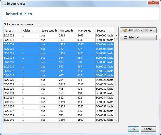 • The Button16-Import.gif Import Alleles button can be used to import sequences for specific alleles. In the opening "Import Alleles" dialog, select the targets for which sequences should be imported, and click Button16-Open.gif Add Library from File. Select one or more files for import. A window opens that allows to select which file should be imported to which target. When the files were created using the Export All to Directory function no action is required here. Click OK in the "Import Alleles" dialog to start the import.