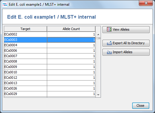 This dialog allows to view the alleles of a cgMLST query. Select a target and click View Alleles to display all alleles for the selected target.