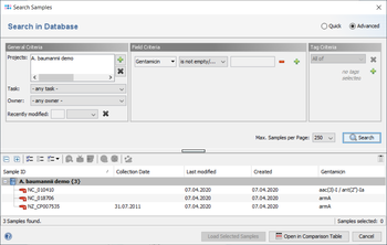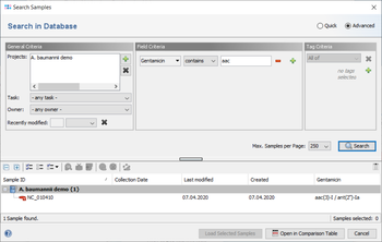 The result fields can be selected from the NCBI AMRFinderPlus entry for searching under 'Field Criteria' in the advanced mode of the sample search dialog. The search can be done either by using the operator 'contains' for specific targets or by using the operator 'is not empty' for any target in this field.