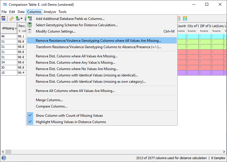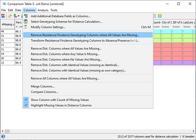 If a resistance profile (presence/absence) comparison of several samples is intended to be done, then the command Columns | Transform Resistance/Virulence Genotyping Columns to Absence/Presence (+/-) may be used. Alternatively handle missing values as an own category when building trees. Next the command