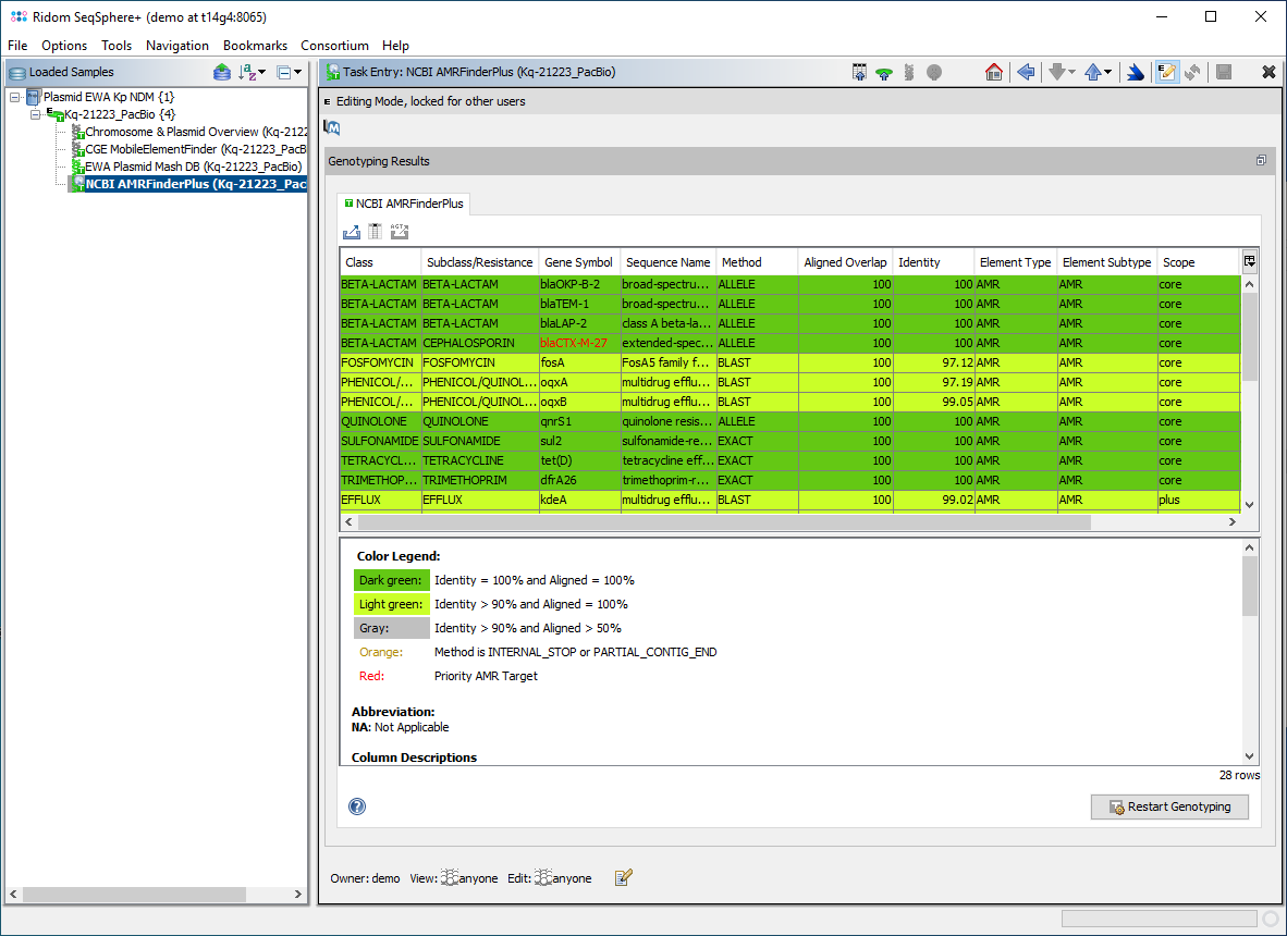 The Task Entry Overview of the processed task entry shows a table with the AMRFinderPlus output with the target genes found. If multiple matches for a target are found on different locations, each match is listed as separate row in the table.