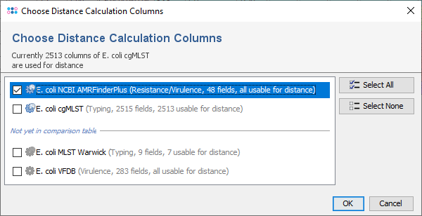Columns | Select Genotyping Schemes for Distance Calculation ... must be elicited and in the upcoming dialog the AMRFinderPlus Task Template must be selected and all other Task Templates should best be deselected from distance calculation. If data were not transformed, then once the command for calculating a tree was elicited in the upcoming missing values dialogue the option Missing Values are Own Category must be selected.