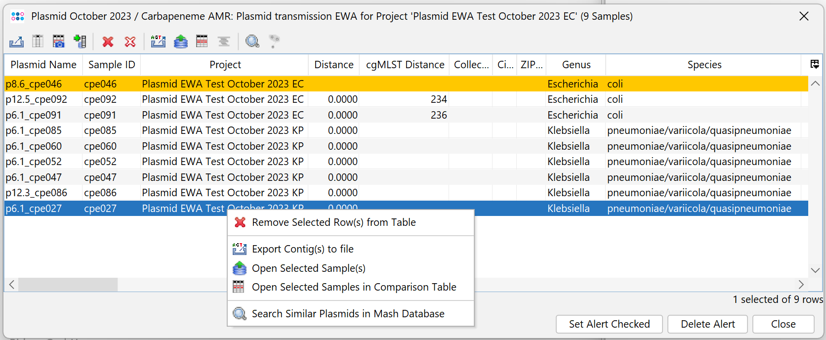 Plasmid Tables that are created for similarity search or Plasmid Early Warning Alerts have the option to do a