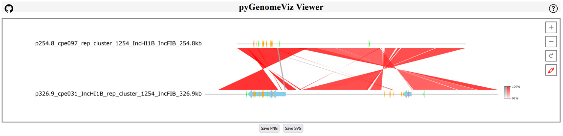 Visualize plasmids with pyGenomeViz. Metadata from the "Chromosome & Plasmid Overview" (rep(s) in green), "NCBI AMRFinderPlus" (AMR priority genes: red, other orange) and "CGE MobileElementFinder" (light blue) are included as genes in the visualization.