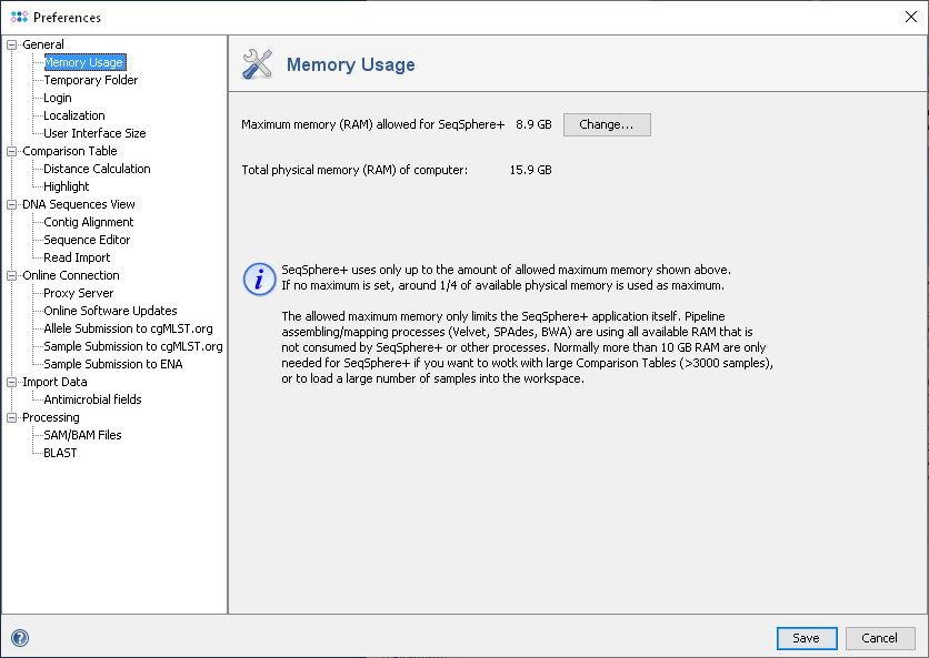 Assemblers that are called in the pipeline are running in an external process and are therefore they not limited by this maximum. However, there must be enough physical memory left available for those external processes. Increase the maximum of memory (RAM) that can be used by Ridom Typer above the default value only if you want to process or load a large number of Samples or if you want to create very large Comparison Tables.