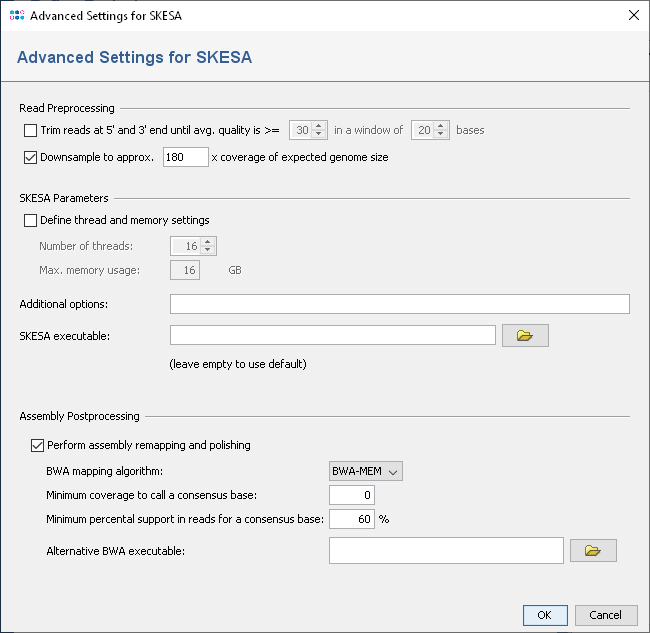 OverviewSKESA (citation) is a de novo assembler for Illumina whole genome read data. It can be used in the assembling pipeline if the Ridom Typer client is running on Linux or if the Windows Subsystem for Linux is installed on Windows. SKESA is De Bruijn graph-based and designed for assembling reads of microbial genomes sequenced using Illumina. It is not suited for assembling data from Ion Torrent or 454 machines. See the page Assembler Evaluation for a detailed comparison of the performance of SKESA, SPAdes, and Velvet. Quality TrimmingSKESA performs a trimming of the read data. Therefore, it is not recommended to use the Ridom Typer read trimming as pre-processing (disabled by default). DownsamplingTo reduce the size of the output files and the time and memory consumption, the input files can be downsampled. Downsampling randomly removes reads so that the given approximate coverage is obtained. If quality trimming is selected, downsampling is done on the trimmed reads. By default downsampling to 180x coverage is enabeled. However, downsampling can be disabled or the coverage can be changed if wished. RemappingBy default a remapping is performed in a pipeline that uses SKESA with the default settings. After the SKESA process has finished, BWA is used to align the reads against the resulting assembly contigs. BWA mem is used as algorithm and for the resulting alignment (BAM file) a new consensus is called. For the consensus calling procedure no threshold for minimum coverage is set. The required read support for a consensus base is 60%. SKESA OptionsThe number of cores (by default all) and the maximum amount of memory that should be used can be specified here. Furthermore, additional command line parameters for SKESA can be defined here (see SKESA manual). If SKESA was used in a pipeline, then the logging output of SKESA can later be viewed in the Procedure tab of the finished Sample. SKESA VersionBy default, the SKESA version in the subdirectory ext/ of the Ridom Typer Client installation directory is used (version 2.4.0). In the Advanced Settings of SKESA in the pipeline script an alternative version can be defined. However, Ridom Typer is only tested with the SKESA version that is delivered with the software. SKESA may be updated with future Ridom Typer updates. |