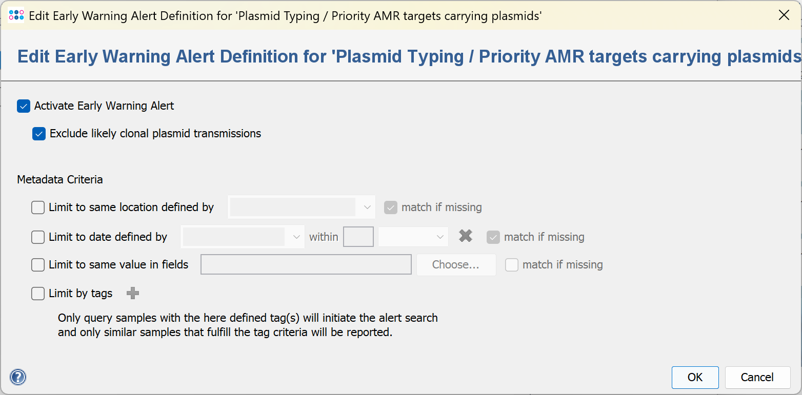 This windows allows to edit an Early Warning Alert (EWA) definition for a Plasmid Typing. Unlike the Early Warning Alerts for cgMLST the plasmid EWAs are defined for a Typing, and not for a Project.