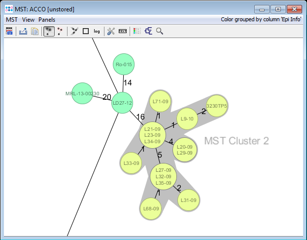 Example of a MST Cluster with 14 Samples, highlighted by gray background color. The cluster label shows the name of the cluster, 'MST Cluster 2'. The cluster distance threshold is by default 10 alleles difference, i.e., clustering threshold (