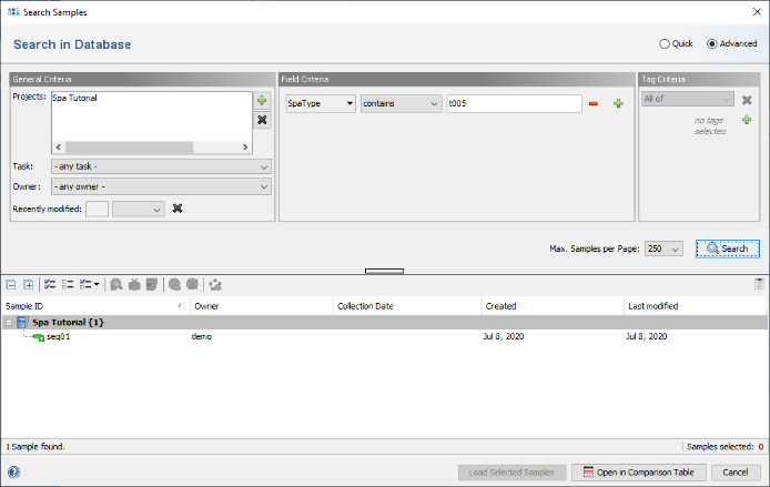File | Search Samples. Select the created Spa Tutorial project in the Project box and press the Search button.