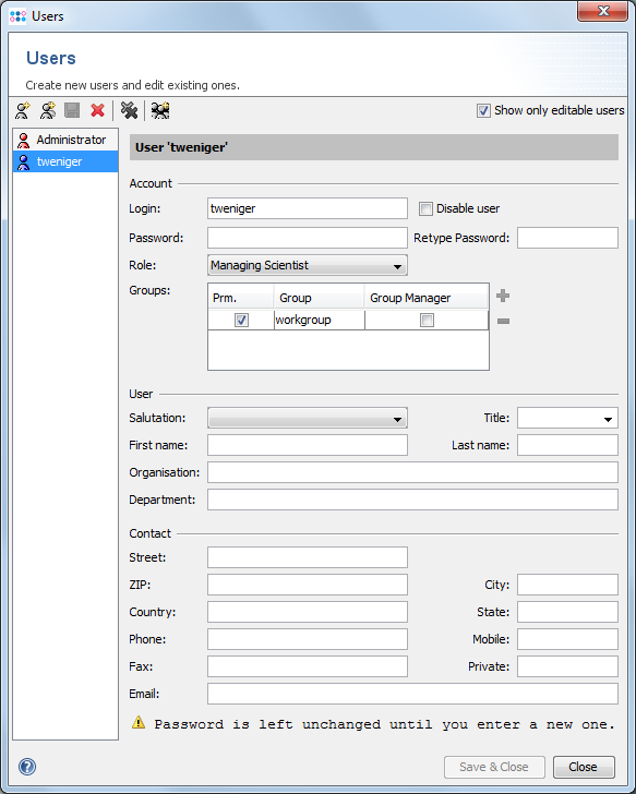 The system administrator can also define new roles using the menu item User GroupsEach user belongs to one or more groups. Groups are used to arrange user accounts according to different rights (view, edit) for data objects in several Projects. If users belongs to more than one group a primary group must be chosen. The primary group may be used in access control definitions. A user with the associated role Managing Scientist may be the manager of a group and may therefore create new users in this group. Creating a New UserYou need to have the user role Managing Scientist or System Admin to create new users! Use the menu function The left button in the tool bar ( Minimally a login name, a password, and the role for the new user must be entered/selected. Furthermore, the first and last name of the new user should be entered. As managing scientist you can only create users with the associated roles scientist, analyst, or visitor. Group memberships of a new user cannot be changed by them; the new user is automatically a member of the same groups as the managing scientist. Disabling a UserCheck the Disable User box to disable a user. The disabled user is not allowed to login on the server anymore. If a user is disabled, it is automatically removed from the number of named users that are allowed by the license. Users with the role System Admin cannot be disabled, until the role is changed. Deleting a UserUse the |
