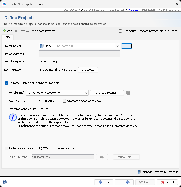 If the checkbox Automatically choose project (Mash Distance) is selected, the pipeline uses Mash Distance to choose the project for a Sample out of the list of projects defined in the pipeline script. Therefore, only one project per species can be defined in the pipeline if this option is used. The option is disabled if project acronyms are used.