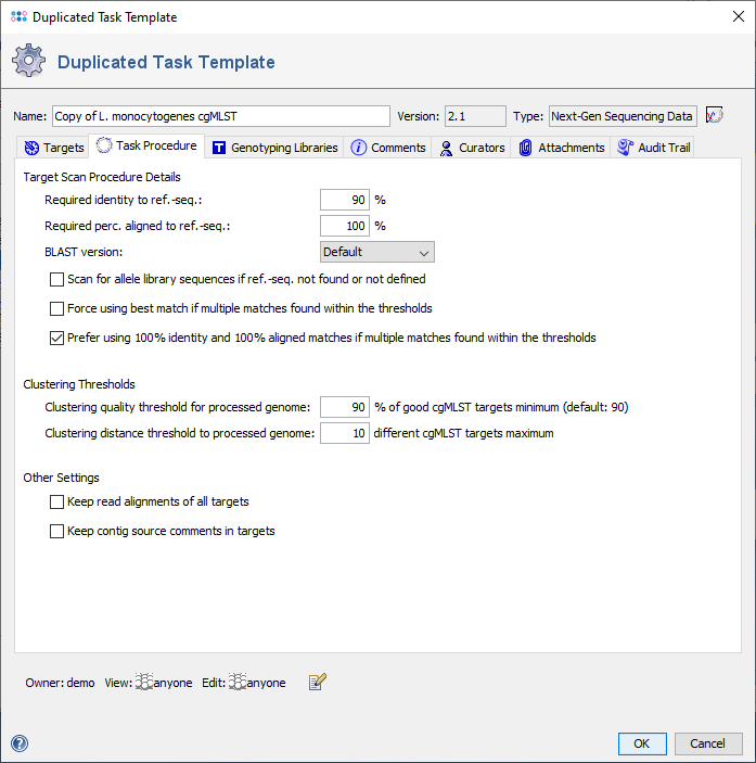 When WGS data is imported, SeqSphere+ scans the data for the target ref.-seqs. from the Task Template (using the integrated BLAST). If the scan finds a unique hit for a target, that reaches the thresholds that are specified here, this hit is imported as Target of the Task Entry.