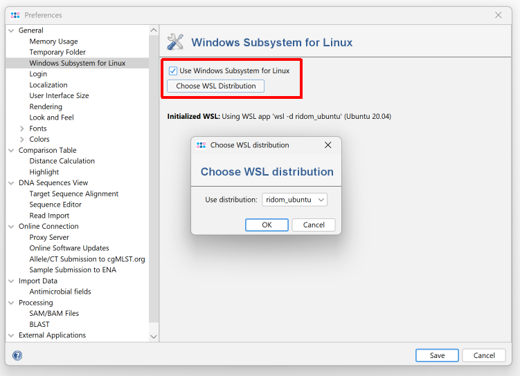 - Step 6: If multiple WSL distributions are available for a user, the distribution that is used by Ridom SeqSphere must be specified. To do this select Options | Preferences from the menu. A dialog window will open. Select General | Windows Subsystem for Linux in the list on the left side. Then make sure that ridom_ubuntu is set as WSL distribution.