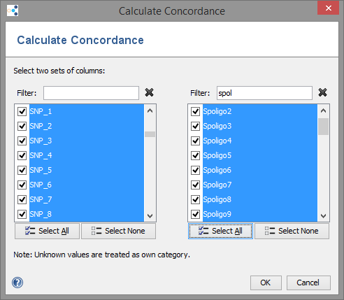Calculate the concordance (Rand's and Wallace's Coefficients) between two sets of columns. This function can be used to compare the results of different typing systems.