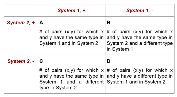 For calculation, pairs of the results of 2 typing systems <math>(x,y): x,y \in {Samples}</math> of all Samples are created. All pairs are arranged in a 2x2 table, according to their type in both typing systems: